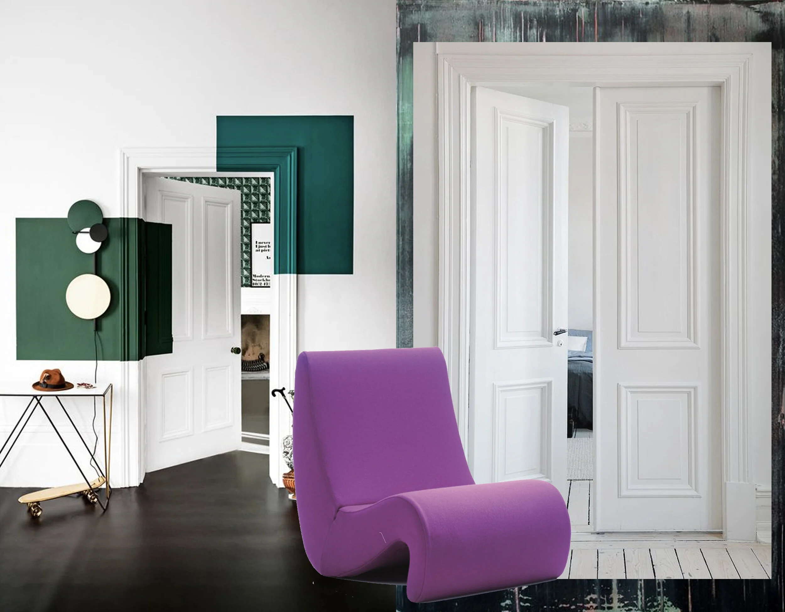 interior on the left Living etc - white door via Ombia - green background via WGSN - armchair Amoebe, Verner Panton Vitra