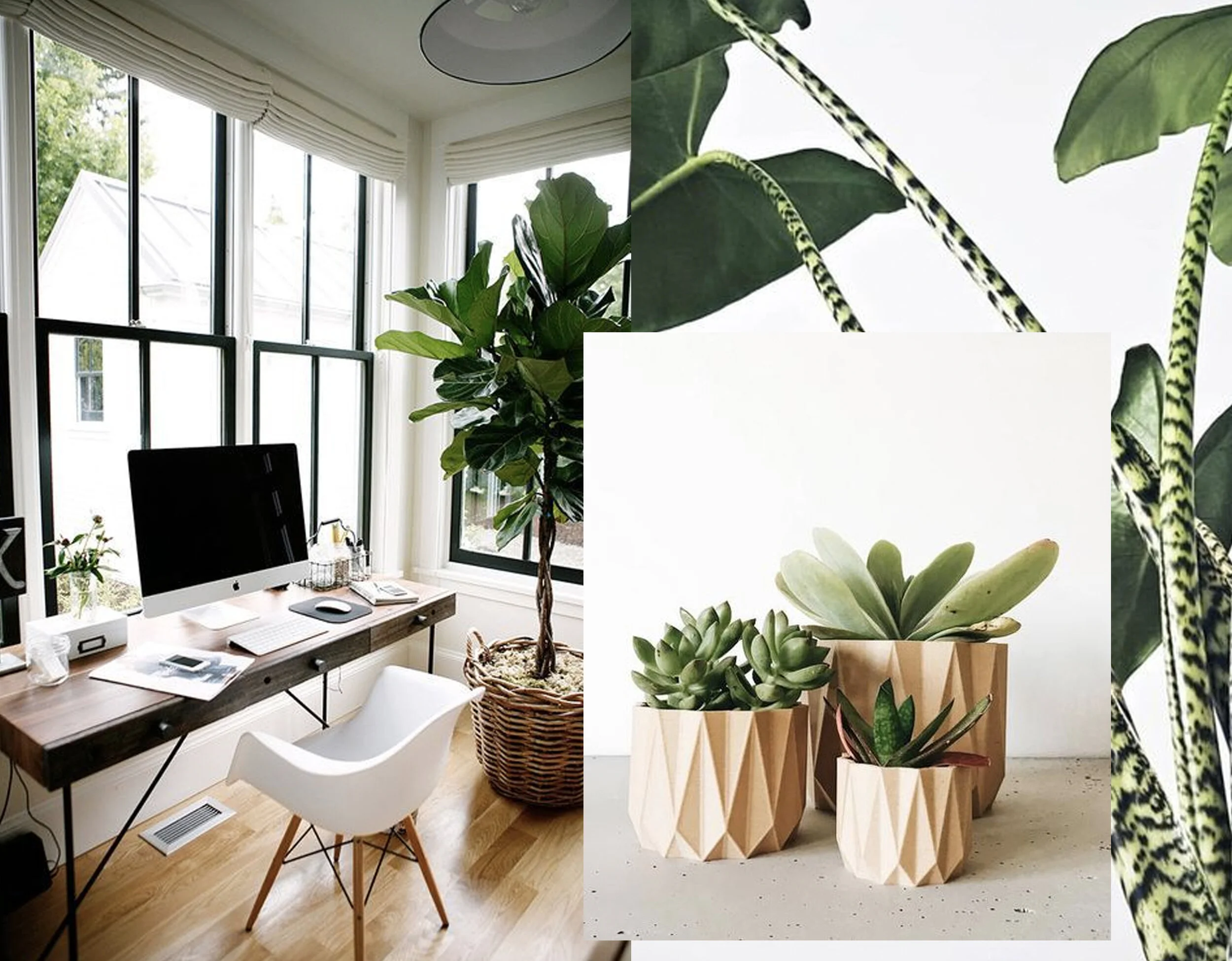 office space via Hi I Am Kelly - small wood planters Minimum Design - plant in background Elephant Ear via Instagram