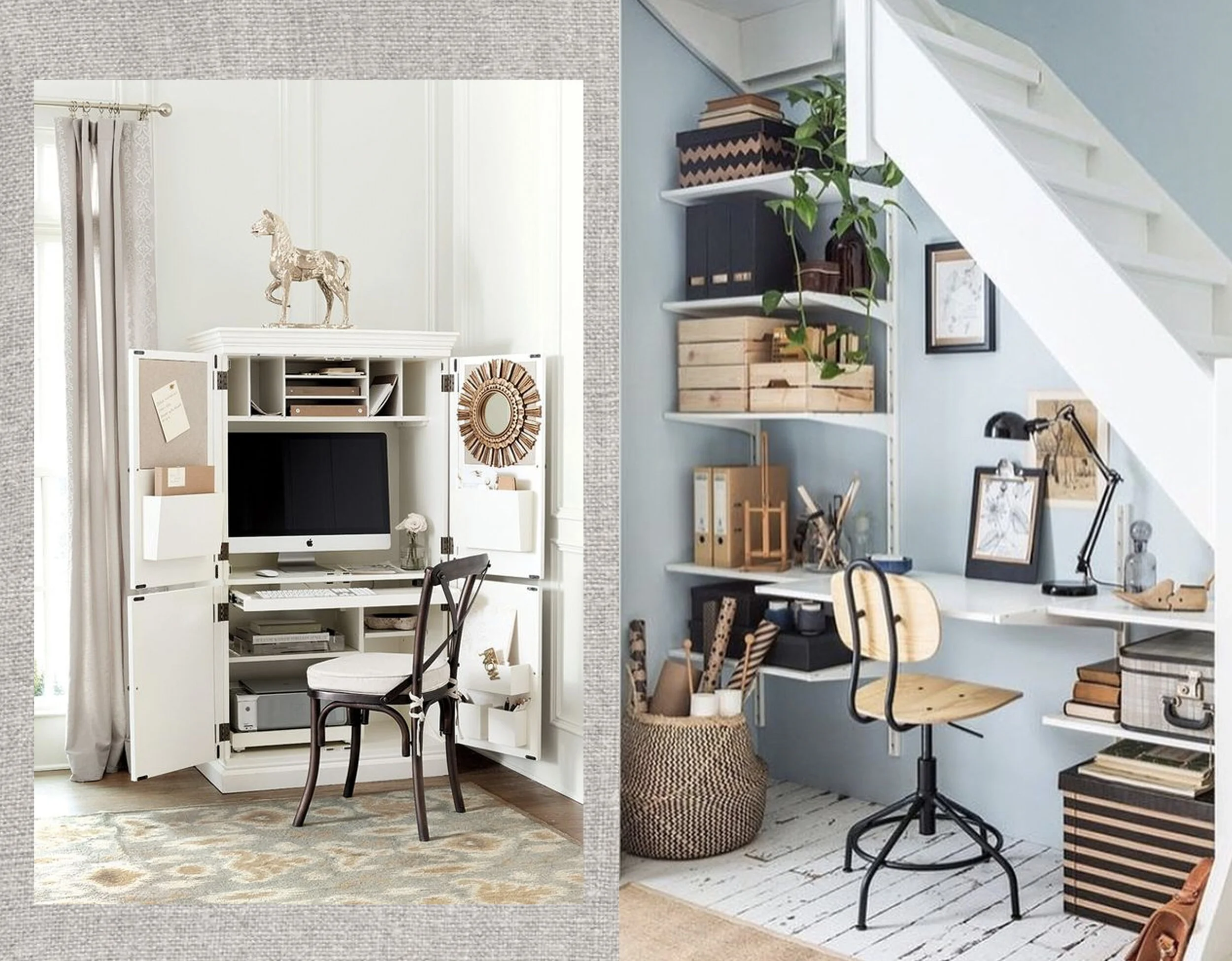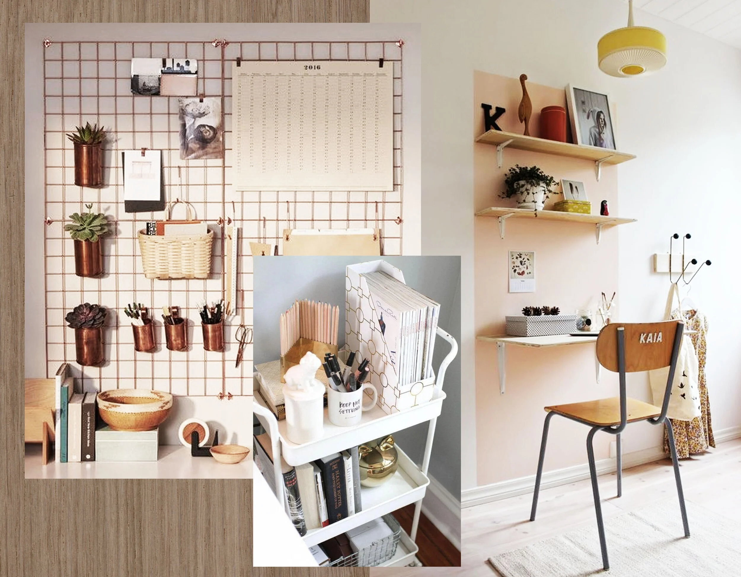 When we have just a small corner in a room to work from than it is essential to keep it well organized and our desk uncluttered. How can we keep it clean? Some small shelves on top, a utility cart which will keep all you need and can be moved easily to another room in the evening or weekend. With a metal grid you can even add some greenery and make it a stylish place.