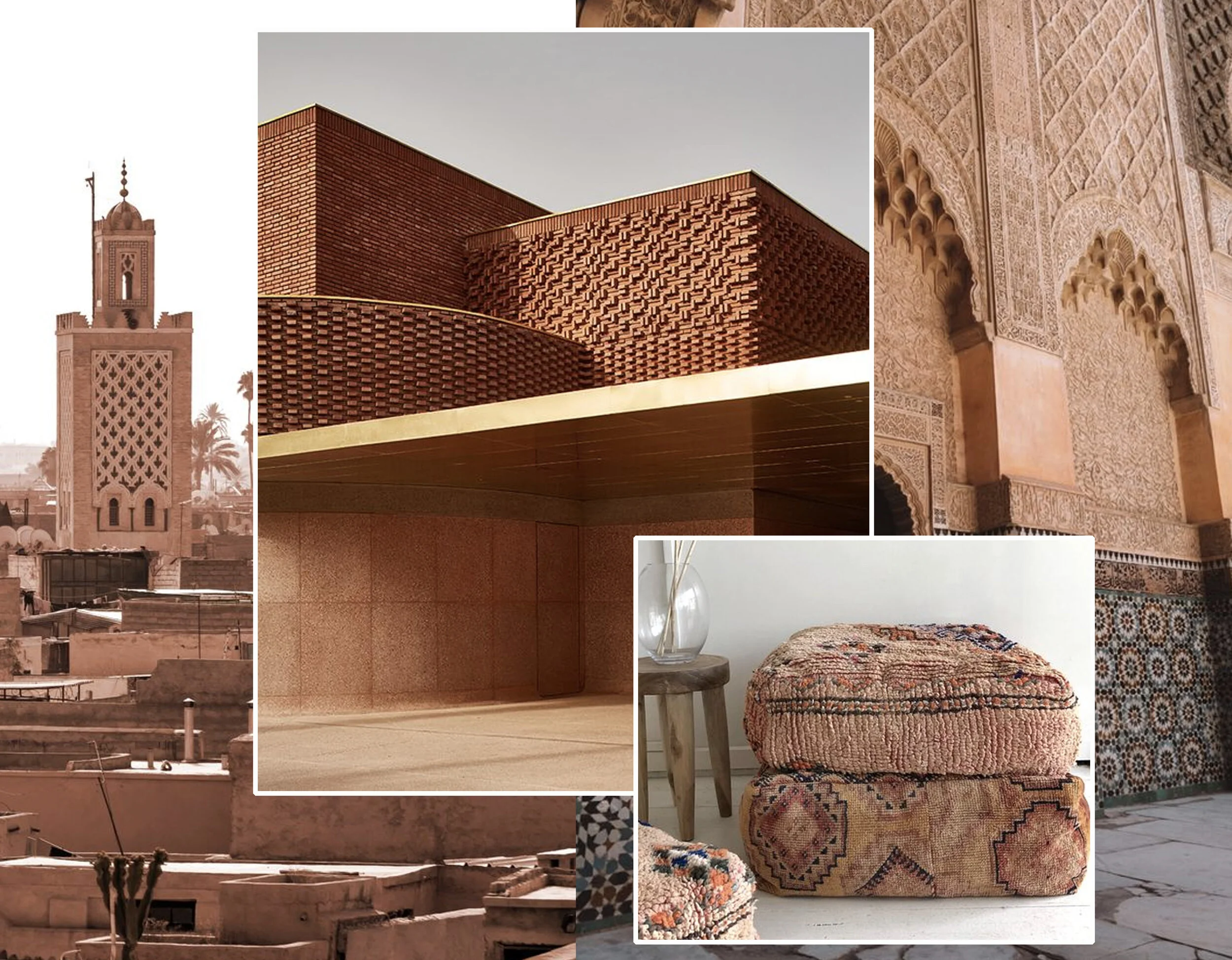 Marrakech via Mi-figue Mi-raison - YSL museum via Wallpaper - Moroccan floor pillows via Aztec House - Ben Youssef mosque by Alex Azabache via Unsplash
