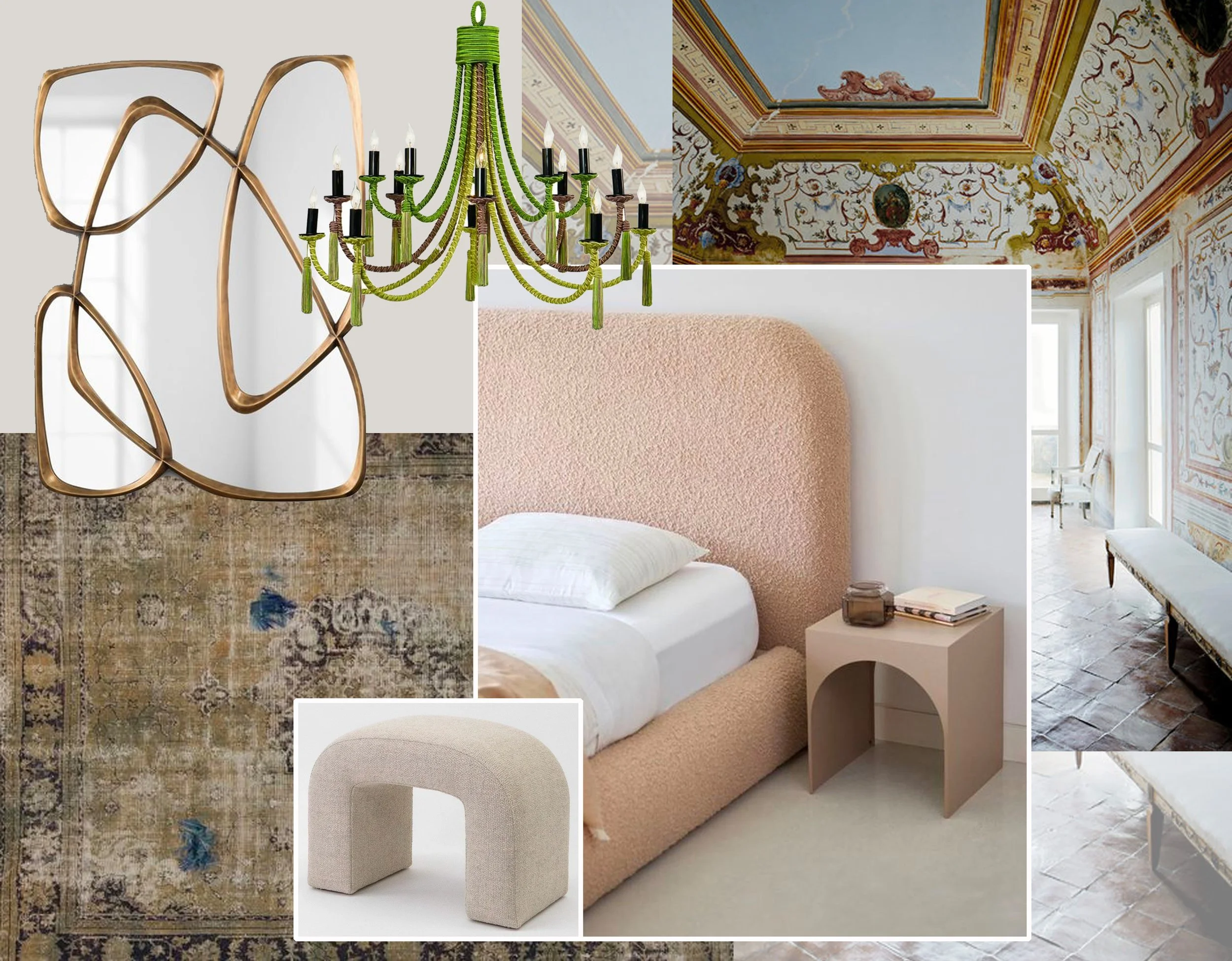 Twombly’s palazzo via Artnet News - Krystal bed Zenn Design - The Little Curved stool Zenn Design - Decolorized rug Golran - asymmetrical mirror Neiman Marcus - Chandelier Wrapped in Passementerie 1stDibs