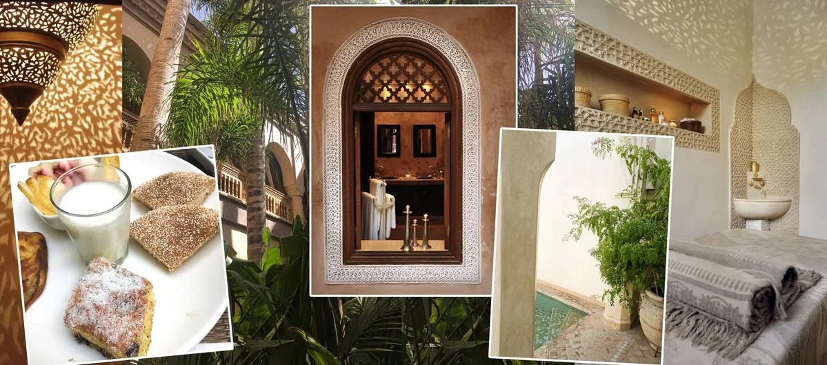 Arriving at the medina, making the last turn to the right, going through a dark corridor and than you open the heavy wooden front door onto a haven of peace. You leave the hectic of the Bab Taghzout district behind you and you feel as arriving in paradis; a patio filled with palm trees and a tickling fountain, covered with rose petals, stucco details, alcoves hidden behind silken curtains, hidden staircases.